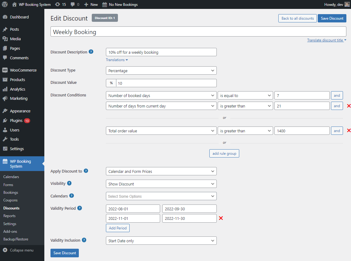 Negative discounts can also be created. These will increase the total price of the booking instead of decreasing it. Useful when you want to add extras to the total price based on the value of certain form fields.
